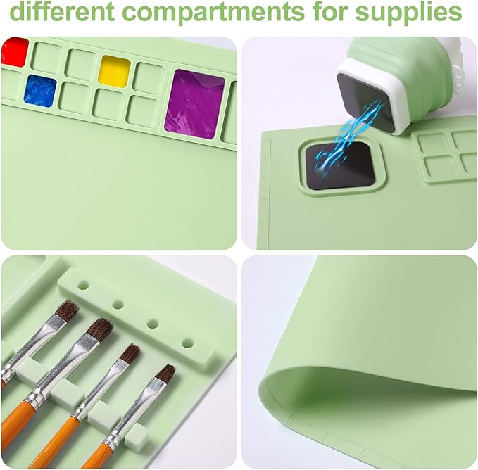 • [LARGE SILICONE MAT]: The size of the silicone artist mat with a water cup is 20ร—16 inches. The slightly raised edge keeps everything on the art mat.