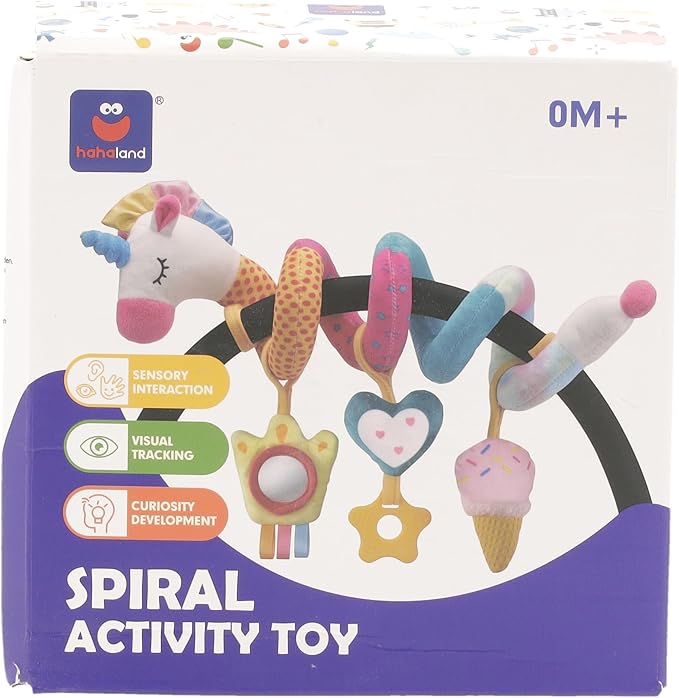 • REMAIN STRETCHED and EASILY ATTACHED TO THE CARSEAT: There are Velcro on both sides of the unicorns spiral plush, which make it remain stretched and easily and safely attached to any nursery device with handles and prevents the toys from falling on the baby's face. The interesting patterns, and vibrant colors appealing to the baby and entertain them throughout the long trip and encourage them to explore them more