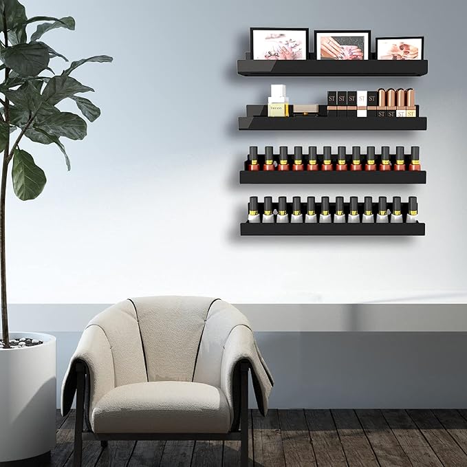 4 Pack 15 Inch Black Acrylic Shelves, Black Kids Floating Bookshelf for Kids Room, Modern Nail Polish Rack Sunglasses Essential Oil Picture Ledge Display Toy Storage Wall Shelf