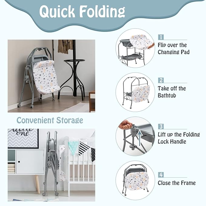 • Portable & Foldable Design: The diaper changing station is equipped with 4 universal wheels that will help move it from one place to another easily. Also, all 4 wheels can be locked for extra stability and safety. Whatโ€™s more, you can fold the diaper changing station within several steps for convenient storage.