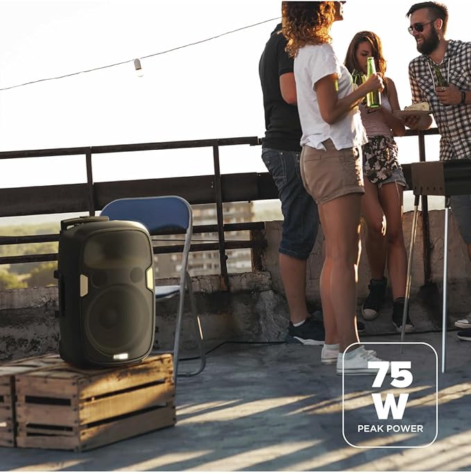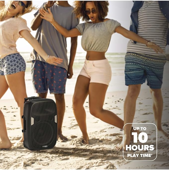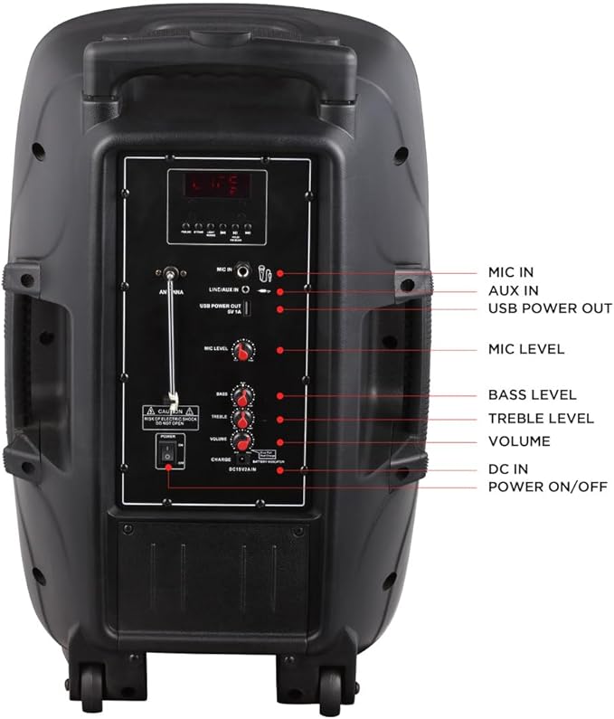 • Carrying Handle: The built-in carrying strap makes this speaker a breeze to bring from one party to the next! It even has wheels so you can simply roll it around with ease!