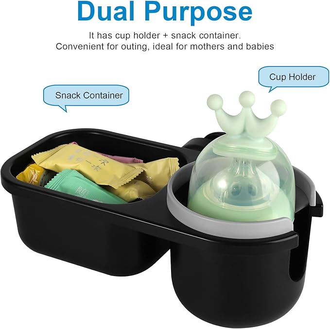 • The 2 in 1 multifunctional holder includes a snack catcher and drink holder for snacks on the go. Ideal for mom and baby.