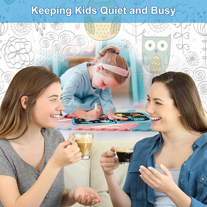 Erasable Kids' Doodle Set, Magic Drawing Book, Reusable 12 Watercolor Pens, 14 Page Car Game Set (Owl Blue)