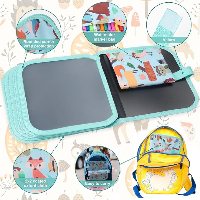Erasable Doodle Set for Kids - Reusable Magic Drawing Book with 12 Watercolor Pens 14 Page Drawing, Road Trip Car Game Writing Painting Set for Boys and Girls (Foxes)