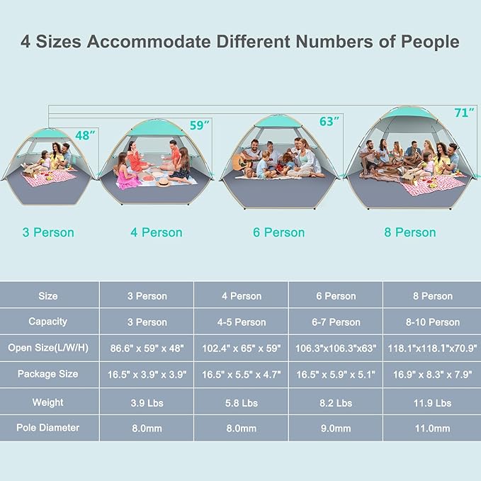 • Super Large Space: Size of 86.6"L x 59"W x 48"H, 30% bigger than other POP-UP tent at similar price, fits 3-4 person. It provides a comfortable space for family and friends on the beach