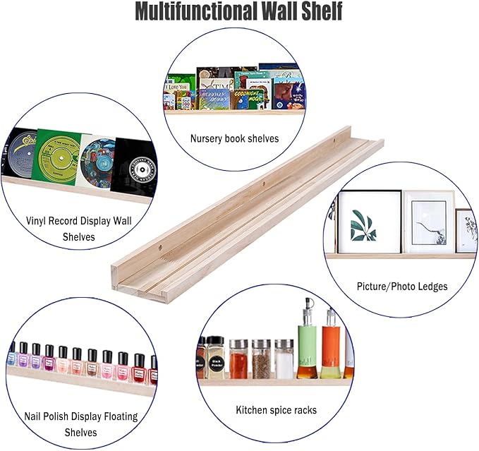 • Ideal for Wall Decor: The size of photo ledges is 48 in x 3.7 in x 1.6 in.This wall floating shelf has no visible floor support, so it makes greater use of your wall space and adds a decorative touch to your home. This wall floating shelf in natural wood color is suitable for various styles of furniture decoration, simple and generous.