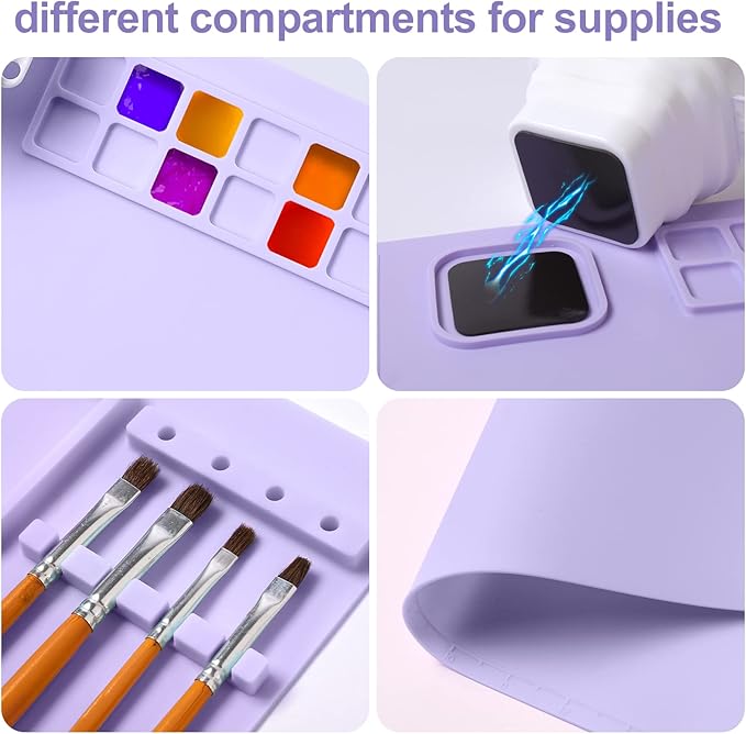 • [UNIQUE DESIGN] - Silicone painting mat has a collapsible attached cup with brush holders on the side and top, built-in paint wells, and brush rests. Keep clean while creating efficiently.
