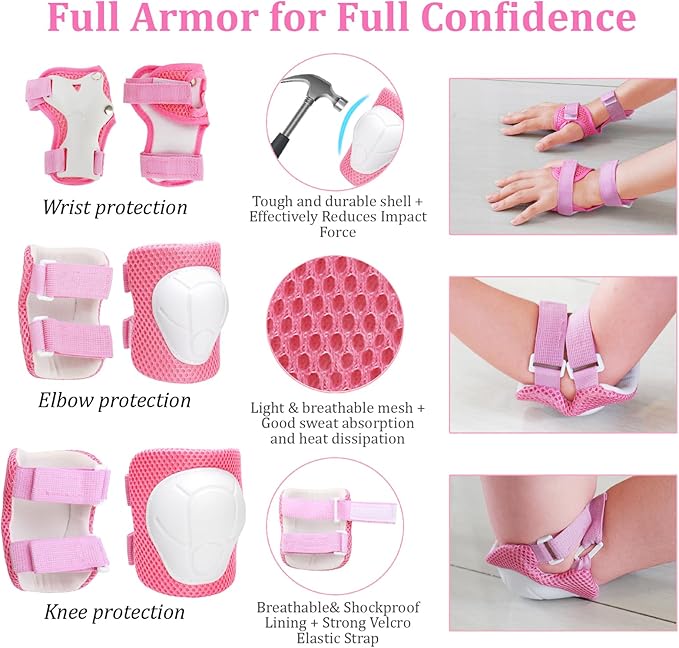 • 【7 pcs Kids Helmet Protective Gear】- Including 1 bike helmet, 2 x Elbow Pads, 2 x Knee Pads, 2 x Wrist Pads. Consist of anti-scratch extra hard ABS shell for hard protection, and adjustable straps ensure the protective gear will not shift. Provides your kids comfortable and safe, A great gift for toddler and kids age 3-8 years old