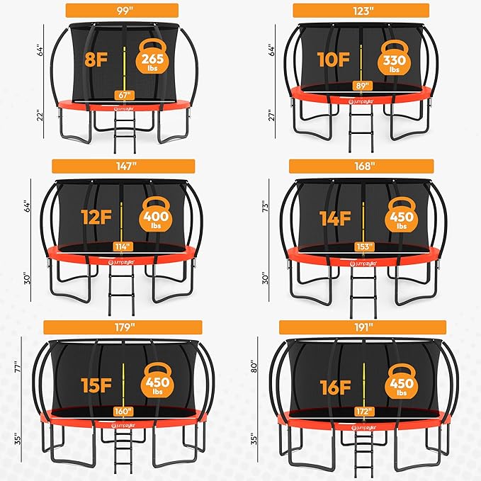 • SIZED FOR EVERY BACKYARD: Whether you have a cozy yard or wide-open space, weโ€™ve got you covered. Available in 8 FT, 10 FT, 12 FT, and 14 FT trampoline sizes to fit your outdoor space perfectly. Jump into fun that fits just right.