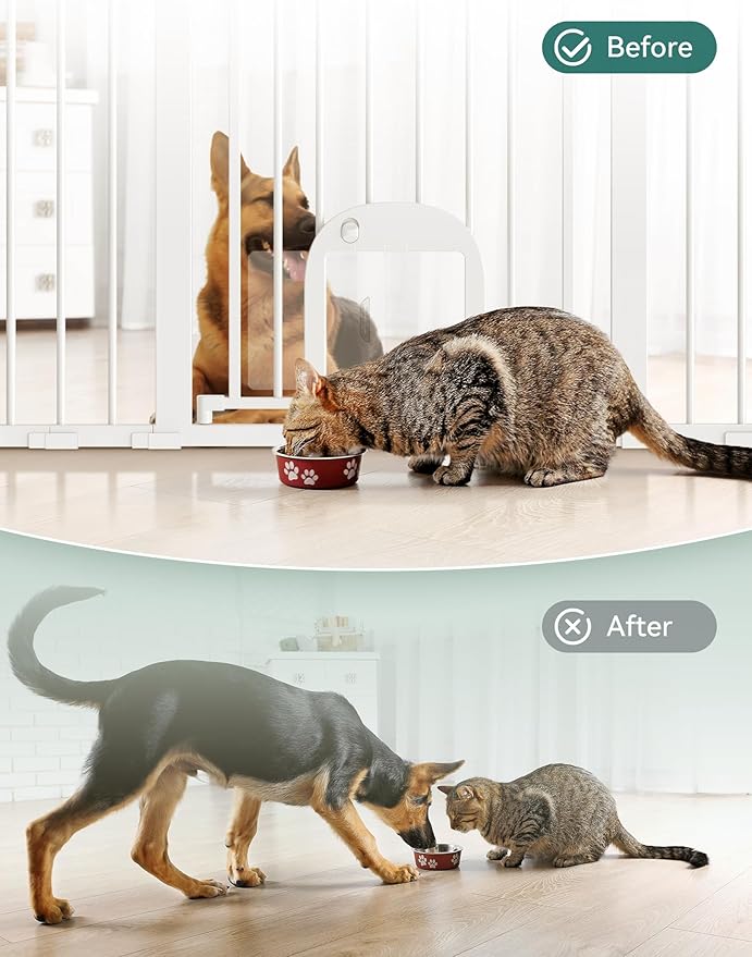 • ADJUSTABLE CAT DOOR: The upgraded 7 x 5.5" cat door can be adjusted left and right in 2 levels, which solves the problem that other pet door gates do not stay locked in place. It is easy to separate pets of different sizes, never worry about dogs stealing cat food