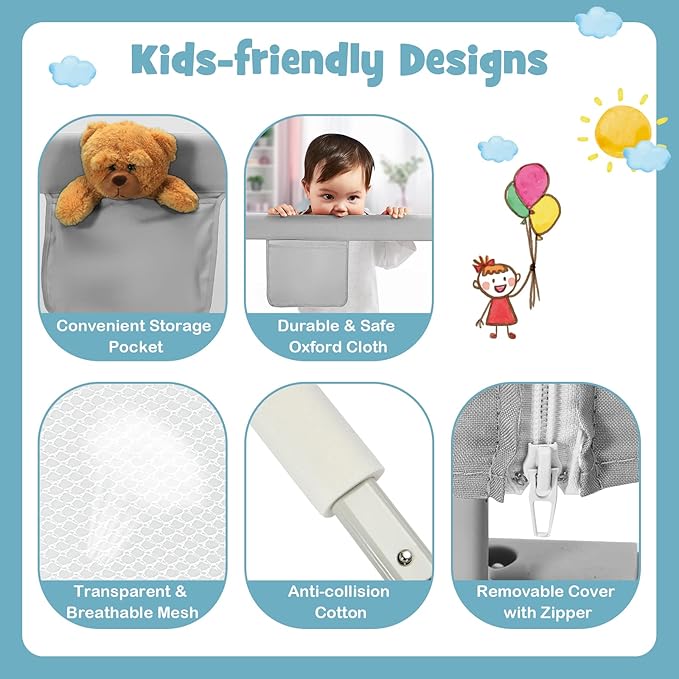 • [ Kids-friendly Material with Safety Ensured ]: The frame of bed rail is made of sturdy steel and wrapped with anti-collision cotton & premium oxford cloth, which ensures excellent stability, safety and durability. What’s more, the breathable mesh keeps good air circulation and is convenient for parents to observe children. By the way, the cloth is easy to remove for daily cleaning.