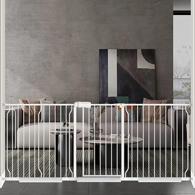 • ADJUSTABLE: Our pet gate can be expanded to fit 85.8-90.5 inches wide openings. This walk thru gate with 19.6 inches swing door makes mothers easier to walk through while holding a baby. Stands 30 inches tall. Reminder: Please measure before purchasing to ensure proper fit