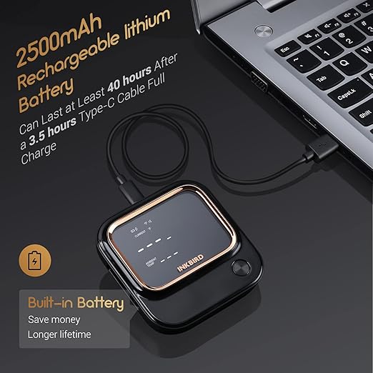• ใ€Different Level Deluxe Design & Readable Backlit LCD Screen & Rechargeable 2500mAh lithium Batteryใ€‘The bbq thermometer with luxury and outstanding design. The screen brightness can be adjusted via the app, the temp data are clear even under the sun. The large LCD screen displays the meat probe readings, ambient/oven temp, the setting temp, high/low temp alarms simultaneously. The built-in battery oven meat thermometer will last at least 40 hours after a 3.5 hours type-C cable full charge
