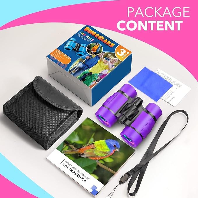 • Adventure Accessories: This fun binoculars is a perfect tool for your kid's outdoor adventure! Package Includs 1x 4x30 Binoculars, 1x Bird Watching Manual, 1x Carrying Canvas Bag, 1x Neck Strap, 1x Lens Wiping Cloth