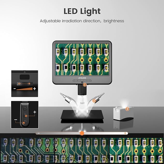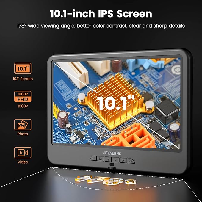 • 【10.1" IPS Screen and 1080P Video Microscope】Featuring a 10.1-inch IPS screen, this microscope is perfect for coin observation, PCB soldering, watch repair, electronics, and DIY projects, allowing efficient, detailed work at a microscopic level. Its 1080P HD video recording and 12MP camera sensor deliver clear image quality, capturing every detail