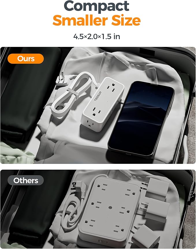 • 7 in 1 Small Power Strip: Extension cord with multiple outlets can be expanded to 4 AC Outlets (1250W Max), 1 USB C and 2 USB A; Low profile power strip with flat head extension cord 10ft can charge 7 devices at the same time, reducing waiting time