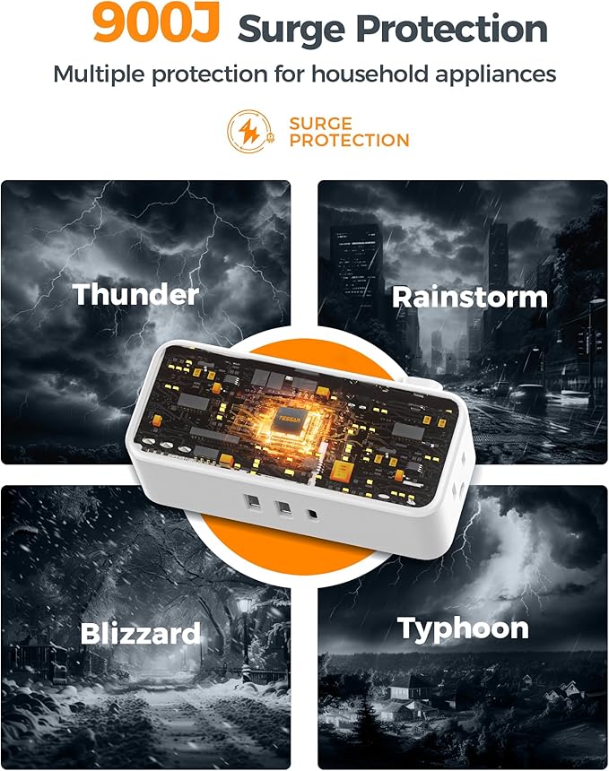 • 900J Surge Protector Outlet: Power strips with surge protection are equipped with short-circuit protection and over-current protection. This long extension cord surge protector can protect your electrical appliances from lighting, surges and spikes