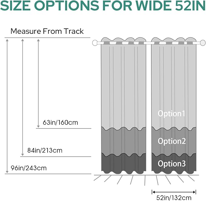 • ★【ABOUT PACKAGE INCLUDE】Your package includes 2 panels of ombre curtains, each panel measures 52 inches in width, a total width of 104 inches. 8 silvery grommets(1.6-inch inner diameter) of each panel make the blackout curtains easy to install and slide.
