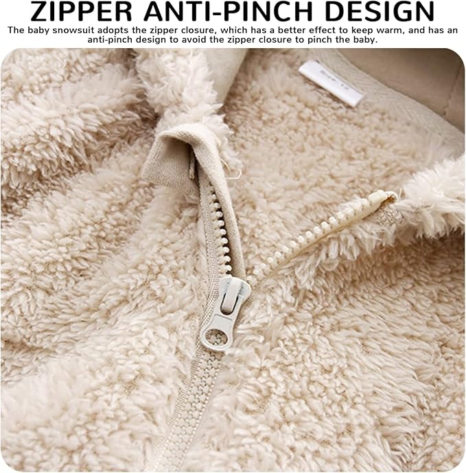 • ??Design: Baby fleece snowsuit jacket warm one-piece jacket, full-cover zipper design to protect the baby from harm, one pull to the end, it is convenient for the baby to change diapers, the flip-up gloves can keep the baby warm and energetic at the same time, the bear ear one-piece cap makes the baby Avoid cold winds outdoors while increasing your baby's charm.