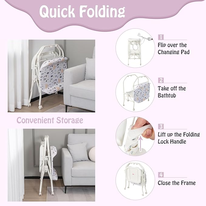 • 4-in-1 Baby Changing Table: This baby changing table with bathtub features a 4-in-1 design for versatility. You can use it to change diapers or clothes for your baby, let your baby take a shower, massage and nurse your baby, as well as hold baby essentials. And the height is appropriate so that you do not need to bend too much.