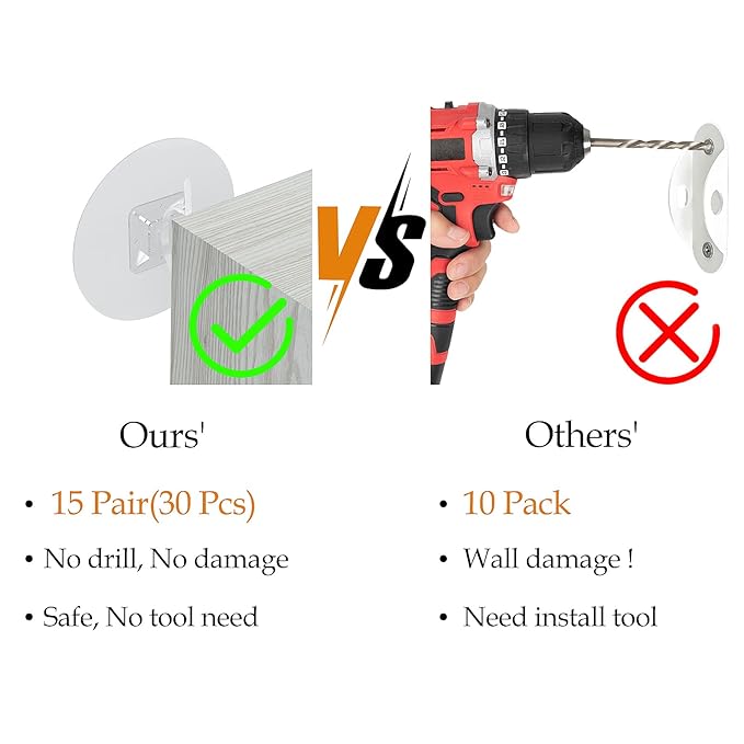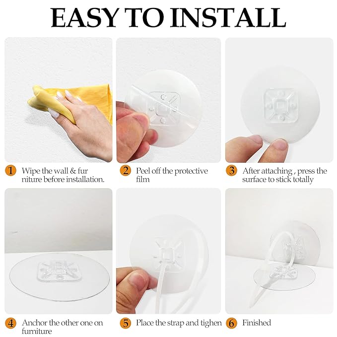 • 🔧【No Drill Wall Anchor for Furniture】: This furniture anchors does not require any drilling, hence making it a better choice for home safety.Easy to install and remove,please wipe the surface both of the wall and furniture before use, peel off the protective film, firmly stick it on the flat and non-porous surface to ensure stick tight, then tighten with the anti tip nylon straps. These wall anchors will not leave sticky adhesive after remove it.