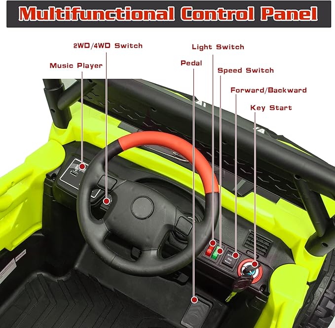 • REALISTIC DRIVING EXPERIENCE- This kids ride on truck has key start design, bright LED lights, horn &engine sounds, adjustable seat belt, lockable doors, foot pedal acceleration, wear-resistant wheels and cool decoration for off-road style, which can attract your kids at first sight