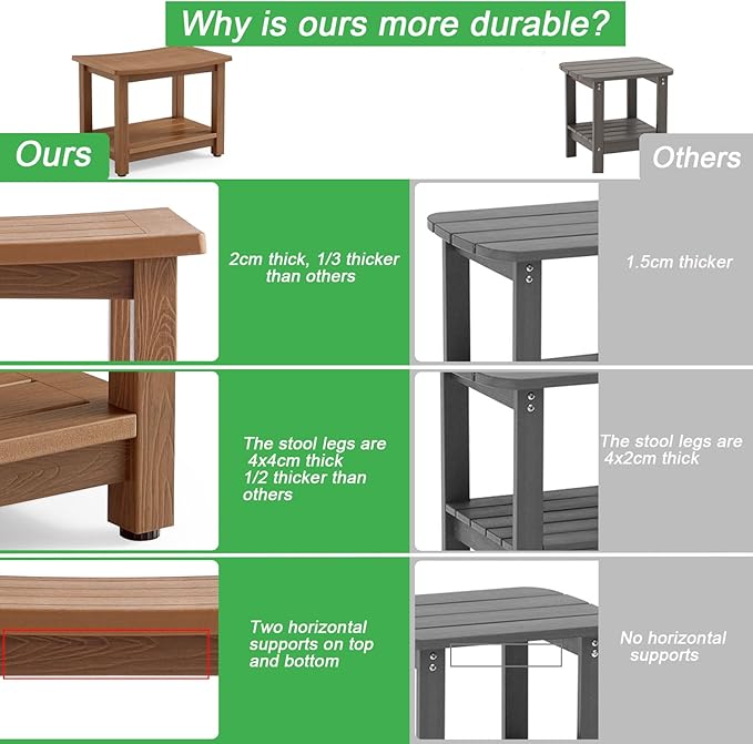 • 【Material & Size】This shower bench is made of polystyrene, it looks like real wood from out look, but actually it's a heavy duty plastic, , no splinters and no maintenance ( 21.3 x 14 x 17.3 Inches).