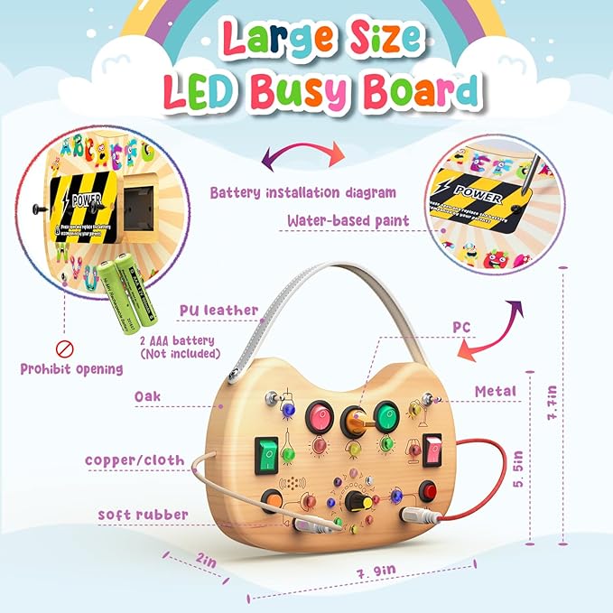 • Creative development : Baby wooden busy board is designed to stimulate children's cognitive abilities and fine motor skills, switch busy board comes with a wealth of ways to play, Flycoost sensory toys can exercise baby's thinking skills and hands-on skills, you can let your little one play for hours to keep their hands and brains busy, is a gift for children at different stages (such as 1 2 3 4 years old ideal gift), please bring your own 2 AAA batteries before use.