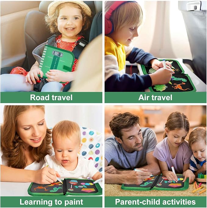 • ๐ŸŽจKid's Road Trip Essentials--Kids Erasable Graffiti Book has sticky buttons on the outside to keep it in place and a pens pocket on the inside for 12 watercolor pens. Even in cars, planes and other means of transportation, kids can draw as much as they want.
