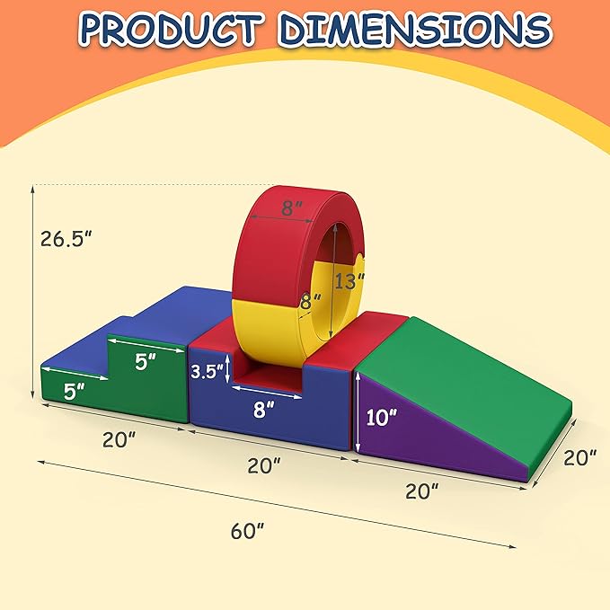 • VERSATILE USAGE: Assembled toddler climbing toys measures 60" L x 20" W x 26.5" H.The inner diameter of the sole circle is 13", enough for toddler to pass through.The colorful foam play set is perfect for indoor use, such as in the living room, amusement park, kindergarten play area, children's training institutions, shopping mall rest areas, etc.
