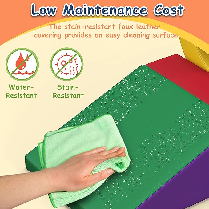 • SOFT FOAM CLIMBING BLOCKS: The soft play equipment are made of soft and durable foam material that is full covered by friendly soft artificial leather. This material is easy to clean and maintain, and it does not emit any unpleasant odors, making it ideal for children to play with