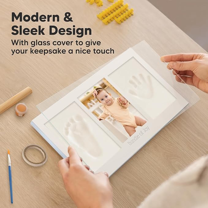 • Sturdy Wood Frame, Real Glass Cover - Our baby handprint footprint keepsake kit maintains its pristine condition for years to come. Itโ€™s a lovely, everlasting newborn keepsake for your baby room decor. A must-have newborn baby essentials.