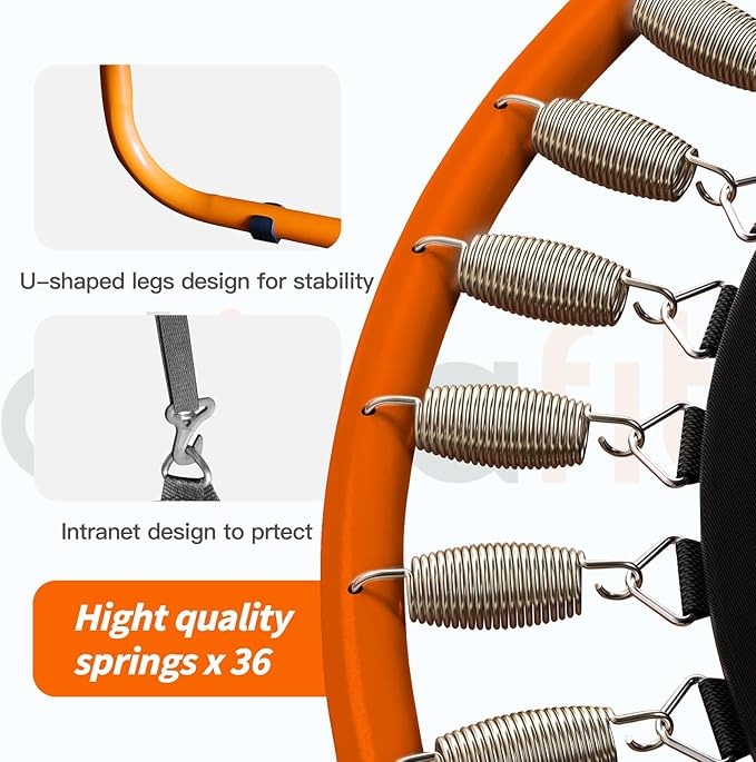 • Super Bouncy: Jumping is joy. With 36 springs, the Ativafit trampoline is super bouncy for an exhilarating jumping experience. The high-quality springs ensure long-lasting performance. Also we have a intranet design to prevent springs showing out. And the U-shaped legs design for stability prevening moving around when your kids jumping on this trampoline.