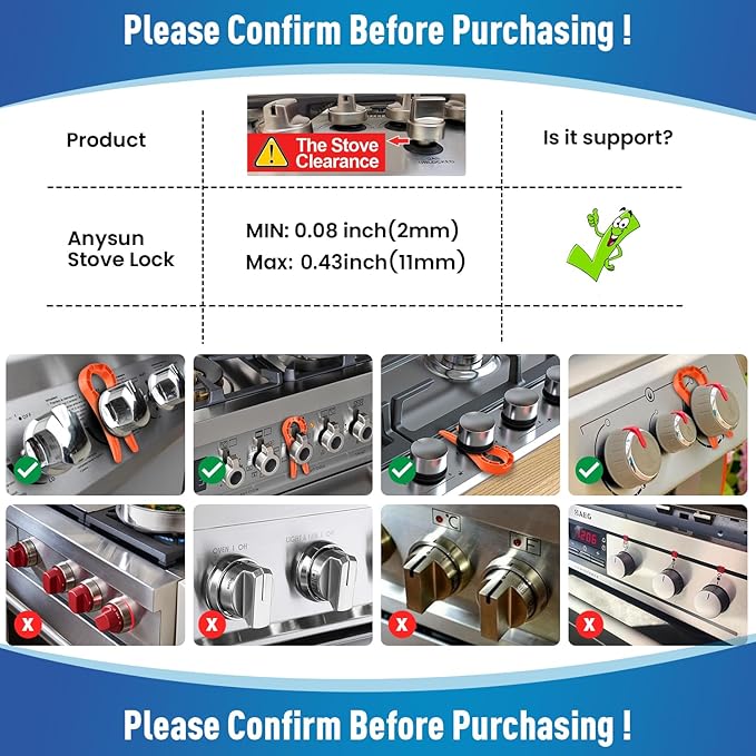 • Please Measure Before Purchase: Measure the gap below your stove knobs (0.17-0.46 inches) and slide the locks behind the knobs for easy installation. Please measure the stove knob before purchase, otherwise, it may not be used.