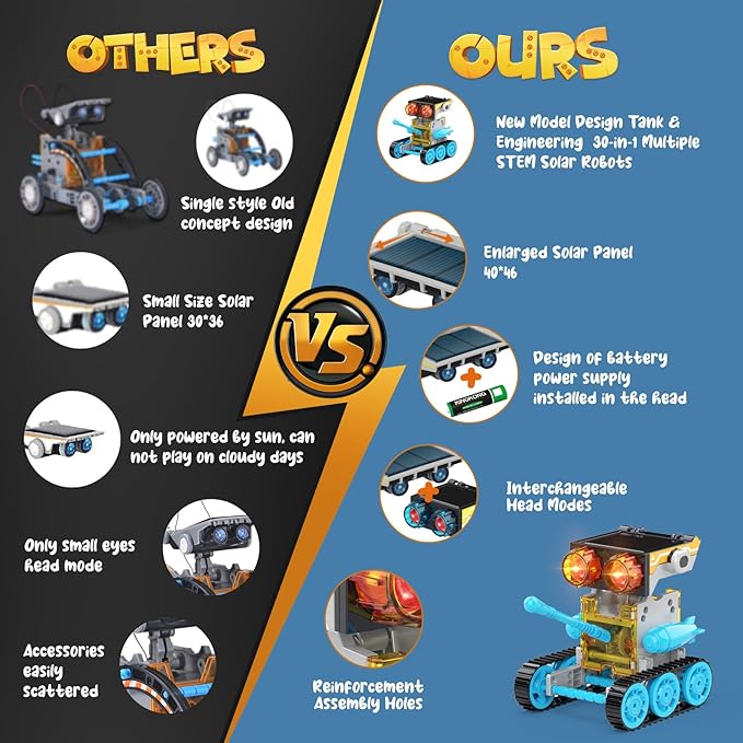 • Upgrade Design Features-Independently Wesfuner 2023 innovated and designed and upgraded STEM solar robots toys kits, the following 5 features optimization improvements: Two new concept shapes tank and engineering vehicle, 2 kinds of power source supply, enlarged solar panel area, 2 kinds of replaceable heads, large-size accessories and deepening the optimization and improvement of the installation hole, accurate track design, more firm, solve the problem that accessories are easy to fall off