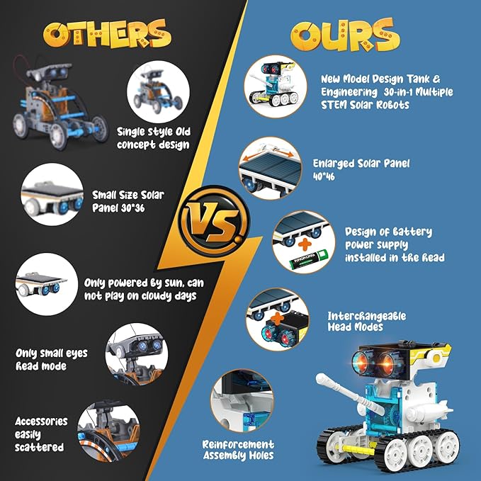 • Upgrade Design Features-Independently Wesfuner 2023 innovated and designed and upgraded STEM solar robots toys kits, the following 5 features optimization improvements: Two new concept shapes tank and engineering vehicle, 2 kinds of power source supply, enlarged solar panel area, 2 kinds of replaceable heads, large-size accessories and deepening the optimization and improvement of the installation hole, accurate track design, more firm, solve the problem that accessories are easy to fall off
