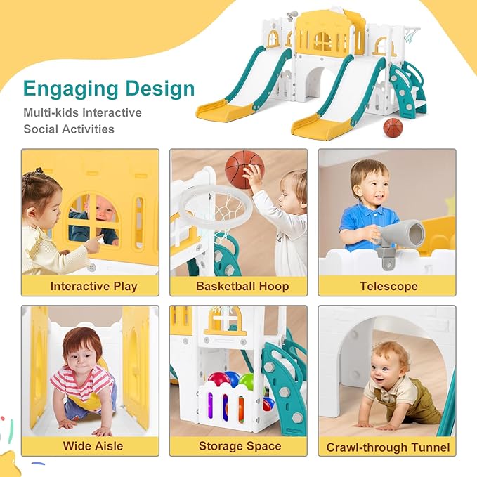 • 【9-in-1 Multifunctional Playset】JOYLDIAS 9 in 1 toddler slide set has 9 activity areas, including double 2 slides, basketball hoop, storage space and non-slip enclosed step, widened climbing ladder, crawl-through tunnel and telescope. It can exercise children's muscle strength, balance and coordination and make the reaction more agile. And add baby's fun during the play.