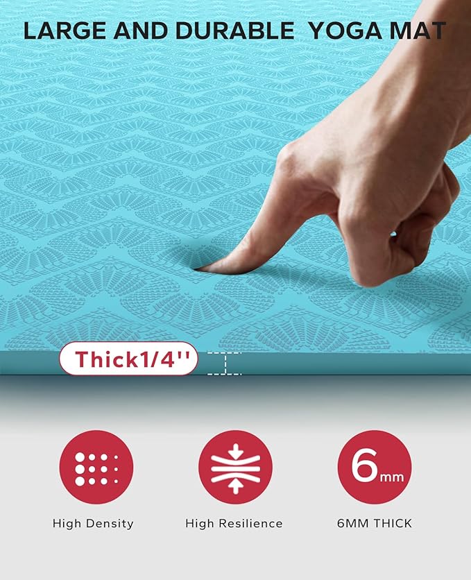 • 𝐄𝐱𝐜𝐞𝐥𝐥𝐞𝐧𝐭 𝐂𝐮𝐬𝐡𝐢𝐨𝐧𝐢𝐧𝐠&𝐑𝐞𝐬𝐢𝐥𝐢𝐞𝐧𝐜𝐞: The exercise mat is 6mm thick, providing excellent comfort and support in various yoga poses. Whether you're a beginner or an experienced yoga enthusiast, this yoga mat can meet your needs. Its outstanding cushioning and resilience will help protect your joints and reduce the stress on your body. We believe this yoga mat will be the perfect companion for your practice