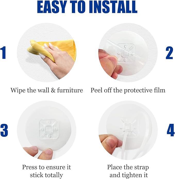 • 【Drill-Free Furniture Wall Anchor】Ensure home safety without the need for drilling. These furniture anchors are easy to install and remove. Simply clean the wall and furniture surfaces, peel off the protective film, firmly attach them to a flat, non-porous surface for a secure fit, and then tighten them with the anti-tip nylon straps. When removed, these wall anchors won't leave sticky residue behind