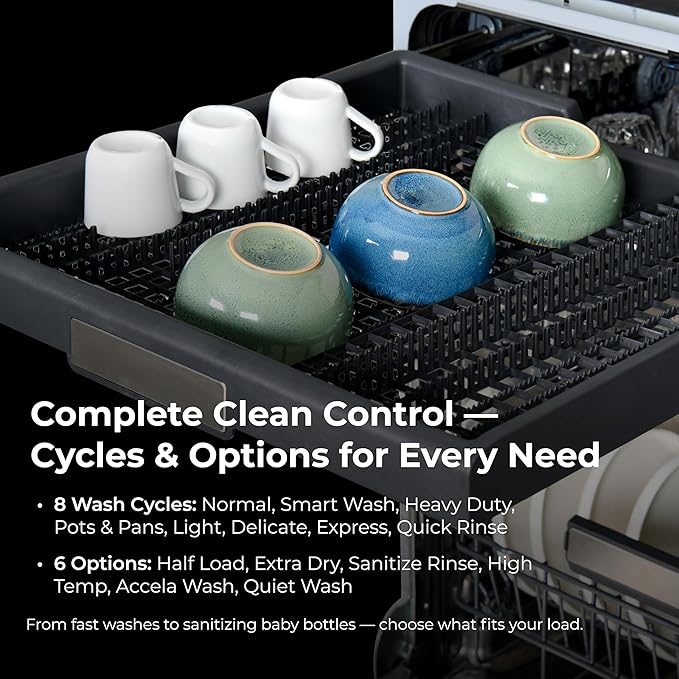 • UltraWash Plus Power Cleaning: Three pressurized spray arms clean dishes from every angle using fresh, filtered water. Accela Wash option cleans dishes if you're in a hurry. No soaking, scrubbing, or scraping needed - just sparkling plates, glasses, and cookware