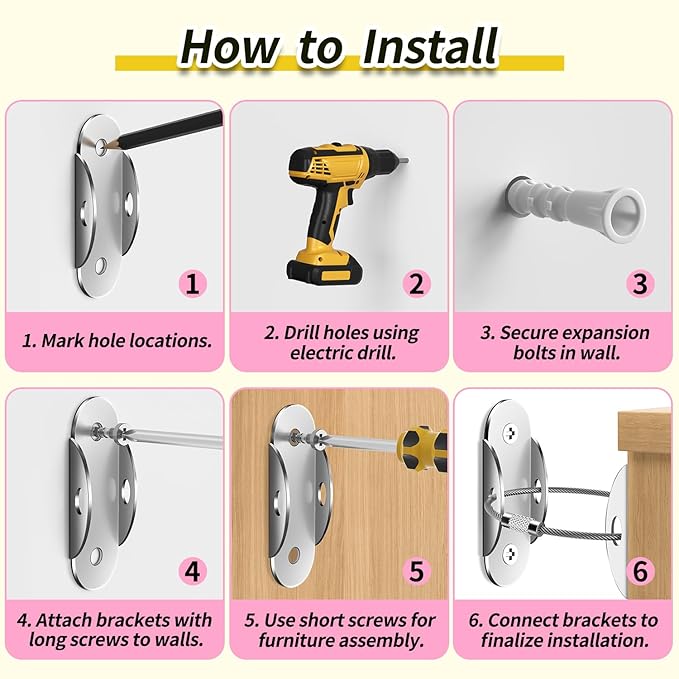 • Premium Material: Crafted from high-quality stainless steel, our baby-proof furniture anchors offer exceptional corrosion resistance and long-lasting defense against rust. Resilient against fire and heat, these anchors surpass plastic alternatives in durability, making them the ultimate guardian for your baby's safety.