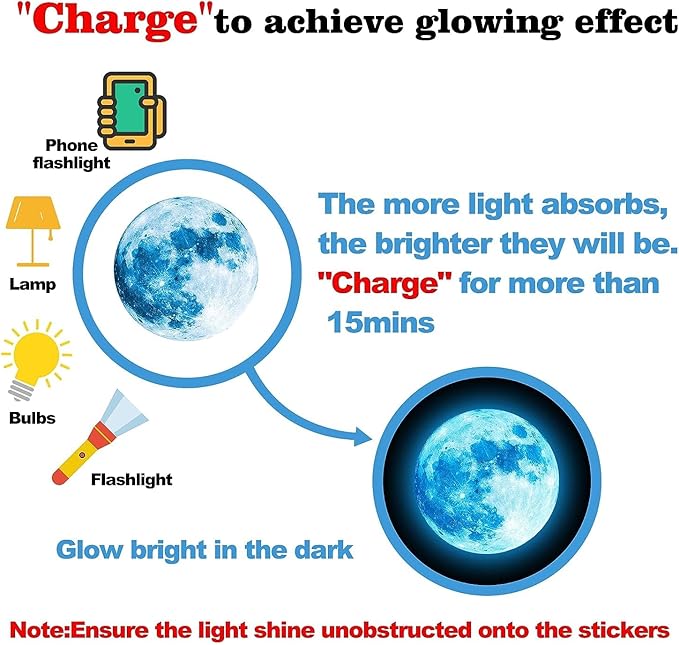 • Glow Like Crazy and Long Time: Our moon and star decals are beautiful,very realistic and glow like crazy,the brightness depends on the light it absorbs.you just need to put them under uv light,room light or flashlight for 30 mins.Note:Please ensure the light shines unobstructed onto the stickers.If you stick our moon for ceiling,please charge them with flashlight or room light before night,we also suggest you stick it close to the lights