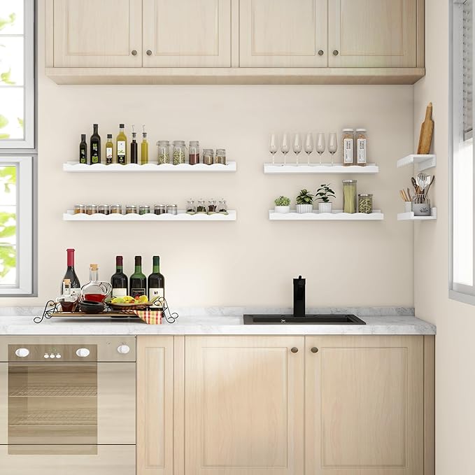 Fun Memories Picture Ledge Shelf for Wall, 16 inch Pine Wood Nursery Book Shelves Set of 4- Wall Book Shelves for Kids Room, Home Decor - Kitchen Spice-White