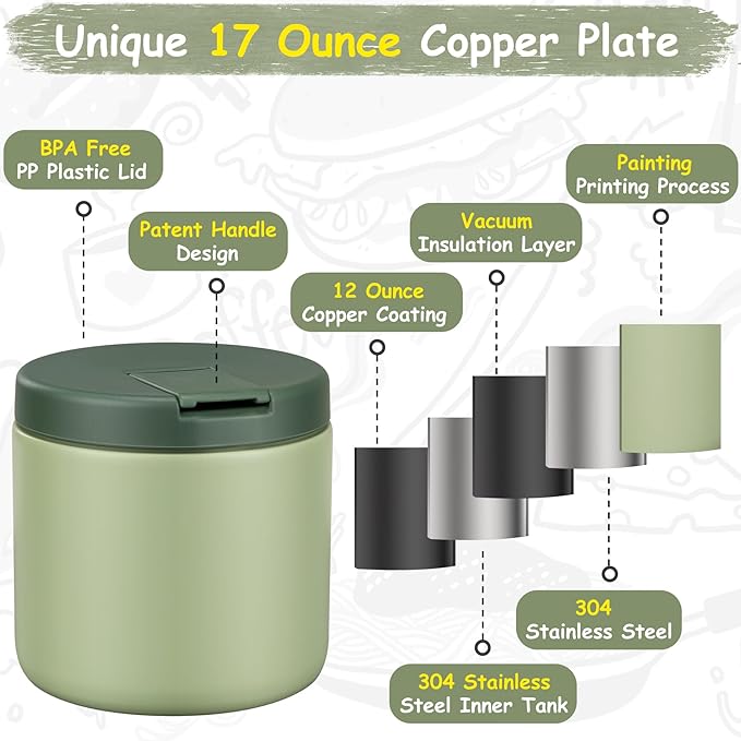 • Keep Food Warm and Cold: Our soup thermo with the insulated 18/8 (SUS304) stainless steel interior with vacuum seal.This will keep your little kids meals warm or cool for 5+ hours. Capacity: 17oz(500ml). Small size and light weight, suitable for home, work or picnic etc.