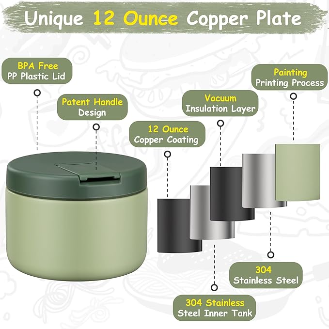 • Upgrade to 12 OZ Capacity: Bigger capacity can hold more food for children. The stainless steel soup thermal bottle is a double wall, with a vacuum in the middle, has good insulation performance, with a wide mouth design that is easier to clean.