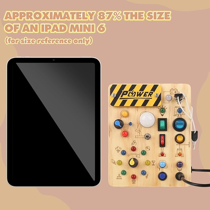 • [ Montessori Busy Board for Toddlers ] Our busy board is placed different complexity switches, which include light bulbs that match the light of the switch. There are 10 different switches and 19 LED light bulbs set on this busy board. This sensory board will help your children enjoy hours of entertainment. Requires 2 AAA batteries (batteries not included).