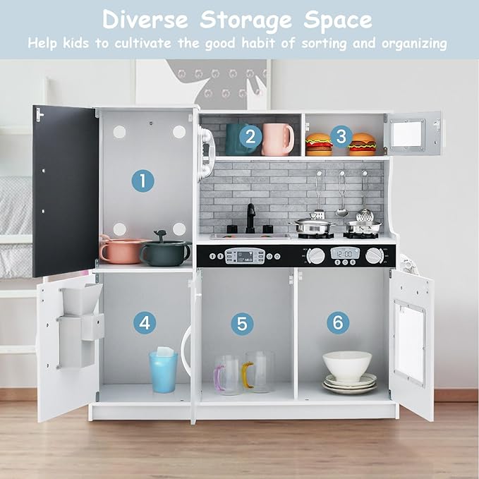 • 【ASTM & CPSIA Certified & Child Secure Design】Made of solid MDF material, this toy kitchen sets is stable and sturdy for long service life. What’s more, the equipped anti-toppling device attaches the kids play kitchen to the wall tightly, avoiding accidental falling.