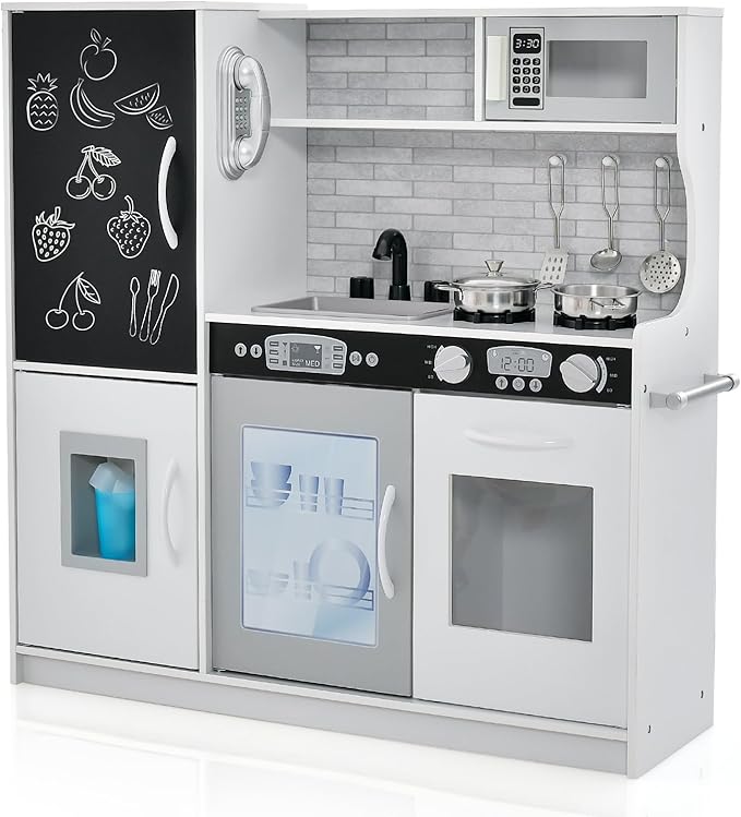 • 【Fun Chalkboard Surface】 With a built-in blackboard, this HONEY JOY kids kitchen playset allows kids to write down the menu today! Stylish backsplash with realistic microwave, fridge, freezer, and dishwasher adds a modern appeal and create an immersive play experience for children and kids.