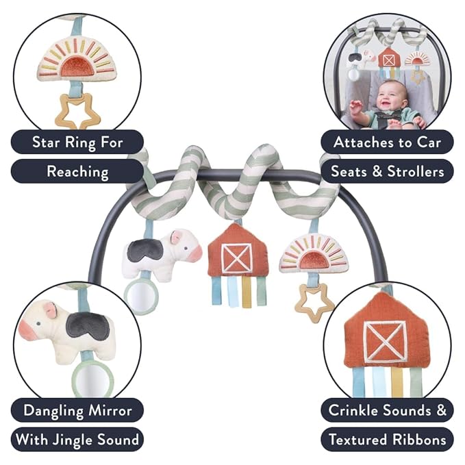 Itzy Ritzy Spiral Car Seat & Stroller Activity Toy - Stroller & Car Seat Toys for Ages 0 Months and Up - Hanging Toys Include Dangling Ring, Mirror and Textured Ribbons (Farm)