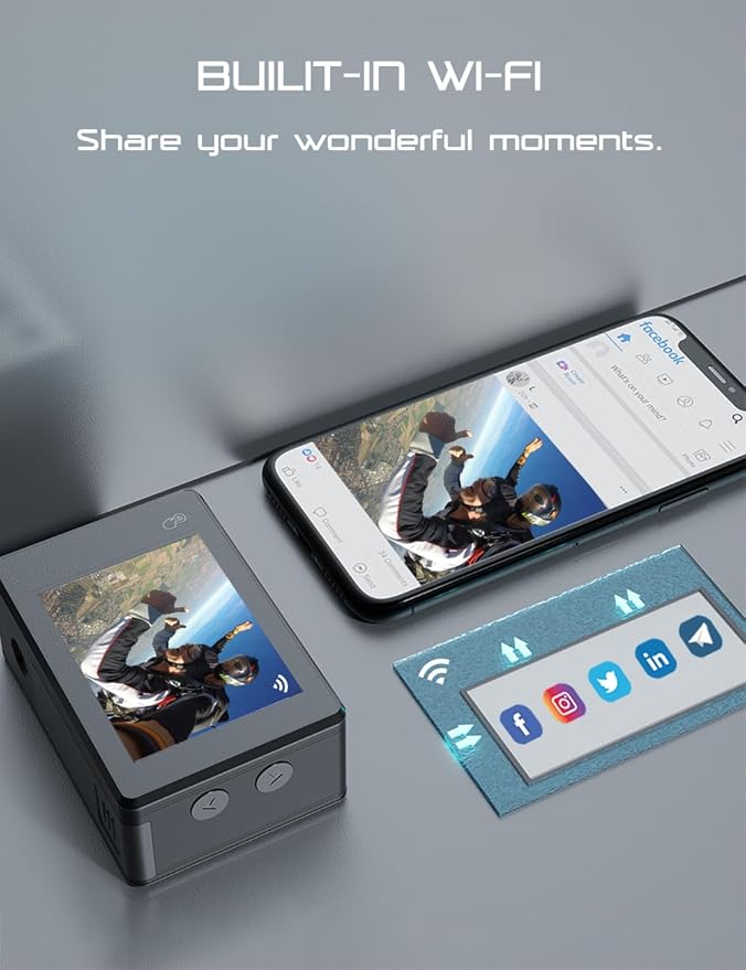 • 📸【40M Waterproof and 2.4G Wireless Remote Control】The included waterproof case protects Apexcam underwater camera from diving to depths of up to 40 meters perfect for swimming, diving, surfing, snorkeling and motor boating. The 2.4G wireless remote control allows you to freely control the camera when you mount it on a helmet, bicycle or other device.